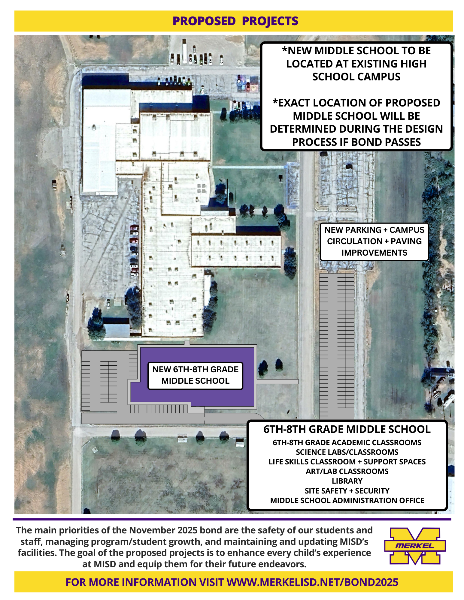 The main priorities of this bond are the safety of the students and staff, managing program/student growth, and maintaining and updating Merkel ISD facilities.